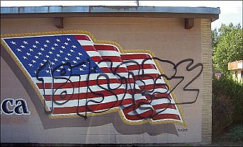The tag showed an abstract, cartoon face painted next to where the mural says 'God Bless America.' It also had '181Sreez' spray painted across an American Flag.