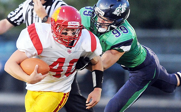 Glacier senior linebacker Caleb Harris tries to get his hands around Missoula Hellgate quarterback Jake Arledge (40) during first-half action Friday night at Legends Stadium.