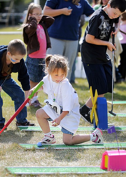 Bailey Ulrick, 5, of Kalispell, works her way through the miniature golf course on Saturday afternoon at the 14th Annual Pete's Fall Fest at Peterson School in Kalispell. Ulrick also competed in the one mile run and took second place in the 6 and under category.