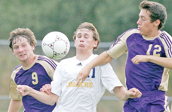 Junior midfielder Barak Lapka flanked by James Larson, left and Riley Lemm vs Polson 9-15-11