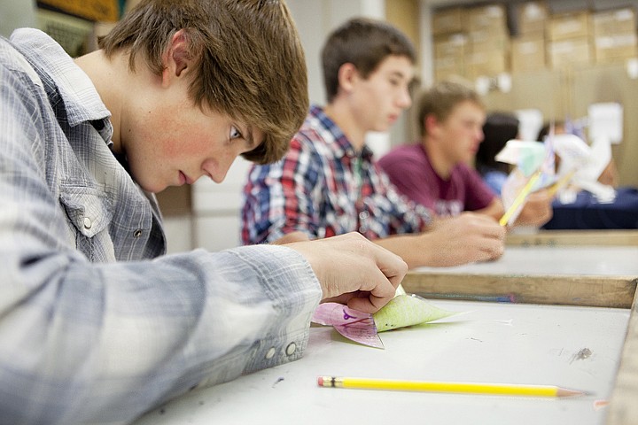 Zach Maas, sophomore at Flathead High School, assembles a pinwheel during Art Survey class Tuesday afternoon.
