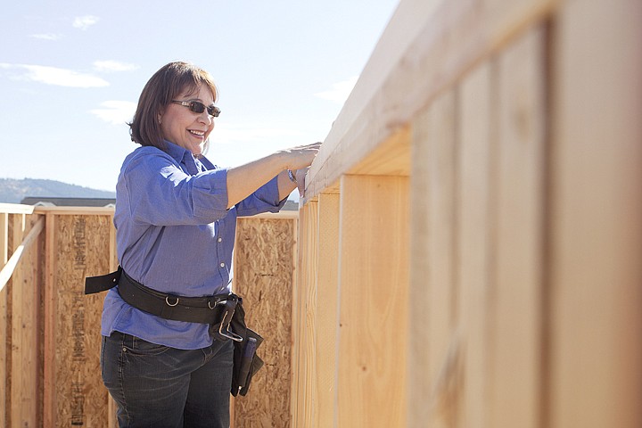 Federal Housing Administrator Tammye Trevino aligns a two-by-four at a Mutual Self-Help Housing Project project site in Spring Creek Estates Thursday afternoon.