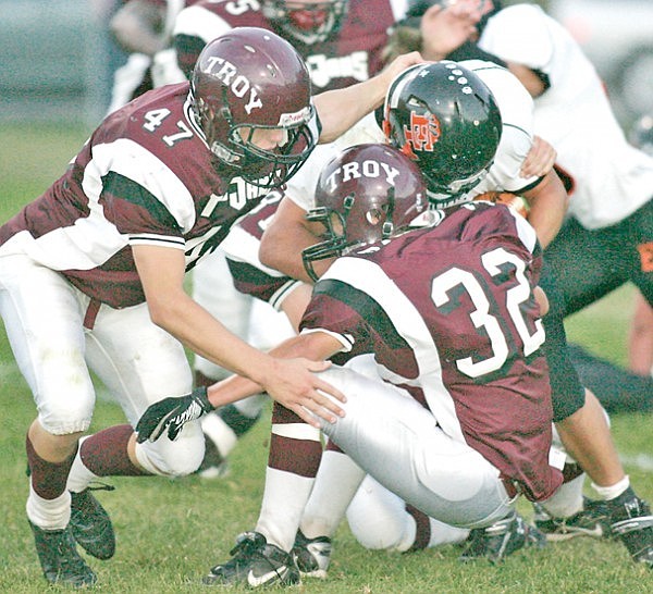 Cory Orr left and Dalton Jones tackle Curtis McDuffie 2nd quarter vs Eureka 9-23-11