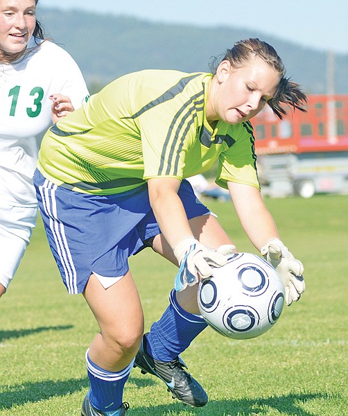 Keeper Rebecca Kyriss with Bulldog Megan Danzcyk behind vs Whitefish 9-24-11
