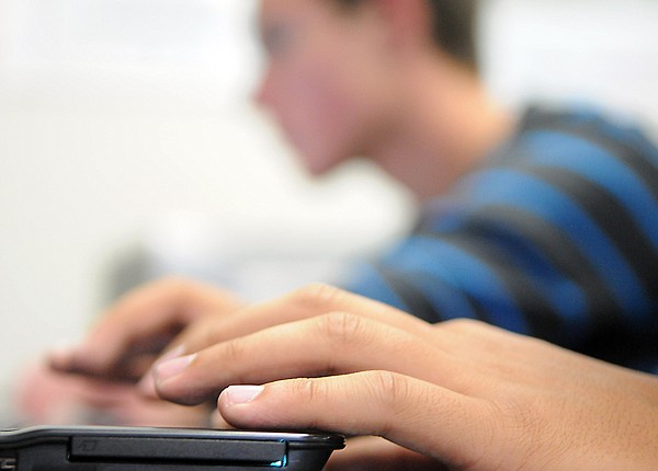 Christian Ruiz, a sophomore, types on a laptop as he works on a video game designing virtual class on Wednesday at Bigfork HIgh School.