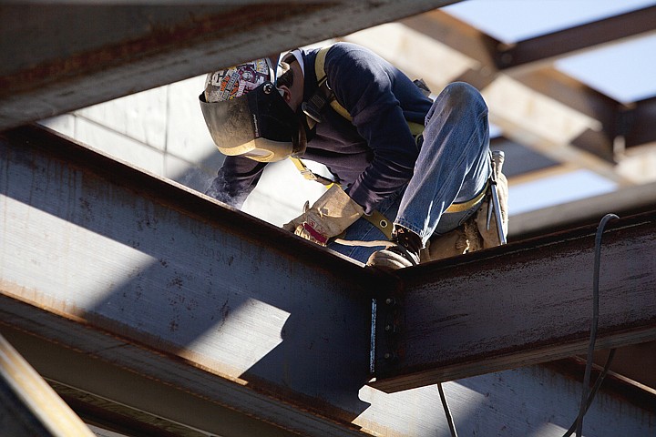 Waylon Felds of Dawson Enterprises welds a butt joint onto a frame piece Wednesday afternoon on the new surgical services tower being built at Kalispell Regional Medical Center. The $42 million project is expected to be completed in October 2012.