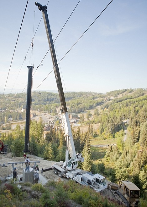 A crane lifts the pole of Tower Six of Chair One at Whitefish Mountain Resort during the reinstallation of the tower on Friday morning. The tower was removed in late June after a slump in the ground caused the tower to shift about 6 inches out of plumb.