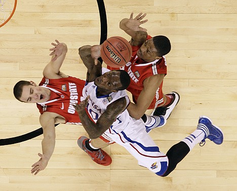 After scoring the game's first bucket, Kansas didn't lead again until Travis Releford made two free throws with 2:48 left. That lasted for 11 seconds, but the Jayhawks (32-6), who trailed by as many as 13, overcame another deficit and finally held on against the Buckeyes (31-8).