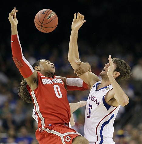 The Buckeyes built an early 13-point lead on the strength of the shooting of William Buford, who came out of a 13-for-44 tournament slump to lead the Buckeyes with 19 points on 6 for 10 from the floor. Kansas trailed 34-25 at the half and only a steal and layup before the buzzer prevented the Jayhawks from a season-low.