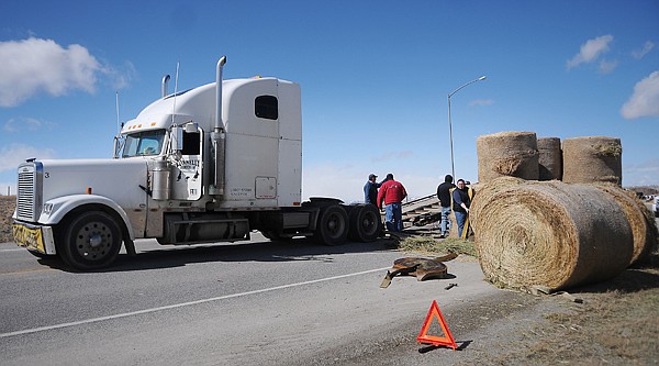Brenda Ahearn/Daily Inter Lake People work to reload a tractor trailer that had a load of hay bales pushed off by the wind on Sunday afternoon just outside Browning at the intersection of U.S. Highway 2 and Heart Butte Road.
