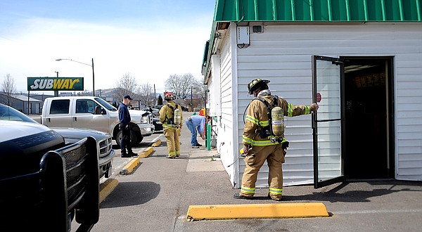 Members of the Kalipsell Fire Department and Northwest Energy respond to a possible gas leak on Tuesday afternoon at the Subway on U.S. Highway 2, in Kalispell. A woman struck the restaurant at 12:50 p.m. causing minimal damage to the building and the gas meter. The Kalispell Police were also on the scene.