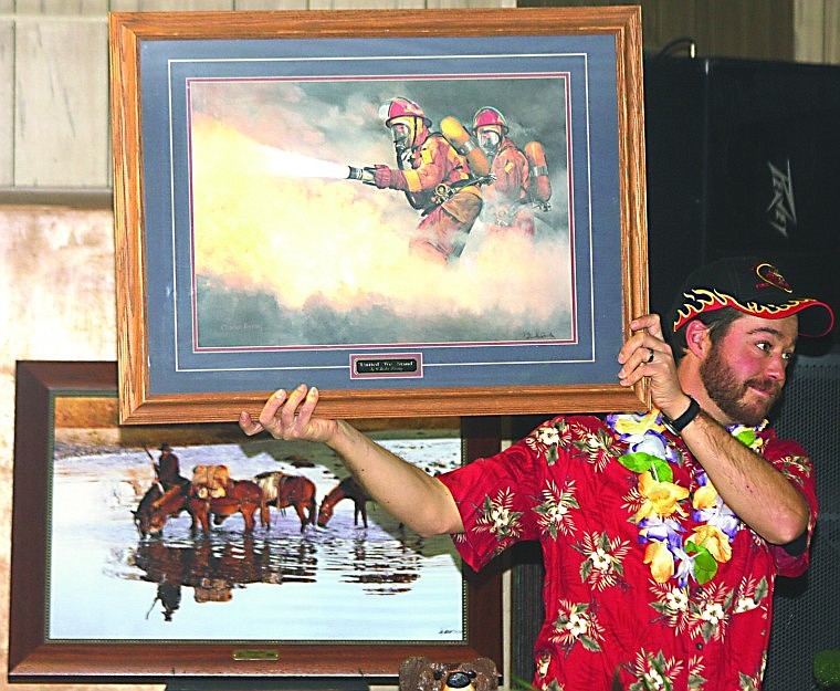 Kyle Johnson of the Plains Volunteer Fire Department holding one of the items up for auction during the Fireman's Ball at the Plains VFW on March 31.