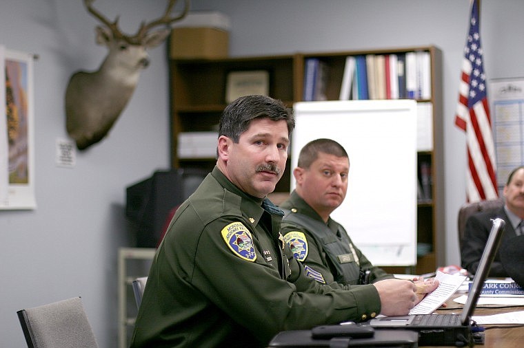 Montana Highway Patrol Captain Greg Watson addresses the public over concerns raised about Trooper Richard Hader by West End Volunteer Fire Chief Bruce Charles at a County Commissioners meeting Monday.