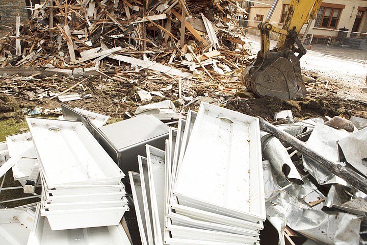 Patrick Cote/Daily Inter Lake Light fixtures from the west annex at the Flathead County Courthouse lay in a pile Saturday morning. The east annex is scheduled to be demolished next Saturday. Saturday, April, 7, 2012 in Kalispell, Montana.