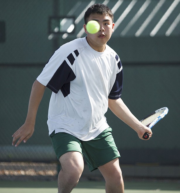 Glacier’s Orson Phattharaampornchai looks to return a serve during a singles match against Bigfork’s Logan Lamm at Flathead Valley Community College Monday afternoon.
