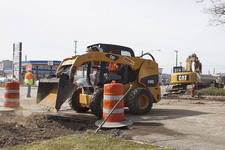 Patrick Cote/Daily Inter Lake A skid steer loader clears debris left at the intersection of Idaho Street First Avenue West. Road work started Tuesday on the reconstruction of West Idaho Street in Kalispell. The project will resurface from just west of U.S. 93 to just east of Meridian Road as well as pour new gutters and curbs. Tuesday, April 10, 2012 in Kalispell, Montana.