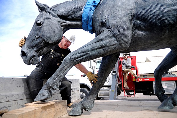 Laird Hill of Crystal Services secures a 1,700 sculpture of two horses to the bed of a truck on Wednesday afternoon outside Kalipsell Art Casting. The horses are part of a 1,250 foot sculpture by artists Rich Roenisch and Bob Spaith of Calgary. Three pieces, consisting of five horses made their way north to Calgary yesterday afternoon.