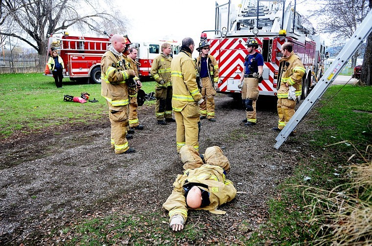 Members of the Kalipsell Fire Department B Shift gather outside a house that now belongs to the fairgrounds on Thursday afternoon, April 12, on West Wyoming Street in Kalispell. The firefighters worked on second story rescue scenarios for four hours.