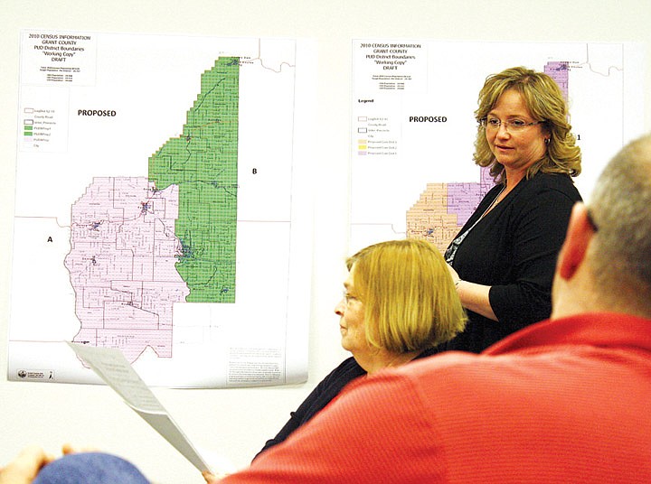At Monday's hearing, Grant PUD executive assistant Randalynn Hovland gave commissioners a brief overview of the newly drawn district maps, saying the intent was not only to get districts in line with current population counts, but to keep it easy for voters.
