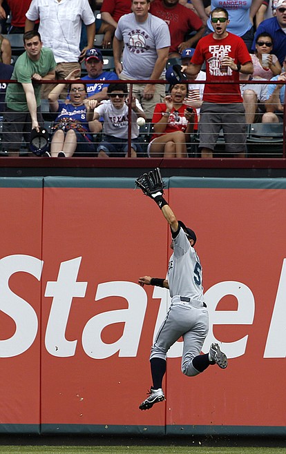 Following Ichiro Suzuki's two-out single in the first, the only runner he allowed in a span of 14 batters was on a throwing error by second baseman Ian Kinsler the first error by the Texas infield this year after 108 clean chances.