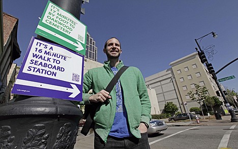 RALEIGH, N.C. - On a January night, under cover of darkness, Matt Tomasulo and friends dared to commit a subversive act: They placed 27 signs at three intersections in Raleigh, advising people how long it takes to walk from one destination to another.