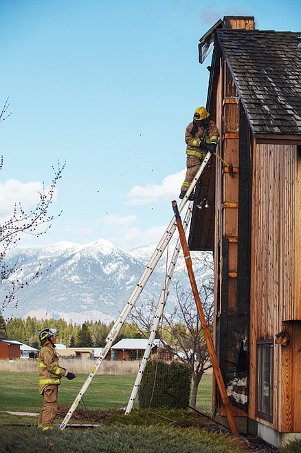 Patrick Cote/Daily Inter Lake Creston firefighters remove siding to uncover hot spots at a chimney fire on east Evergreen Tuesday afternoon. Tuesday, April 17, 2012 in Kalispell, Montana.