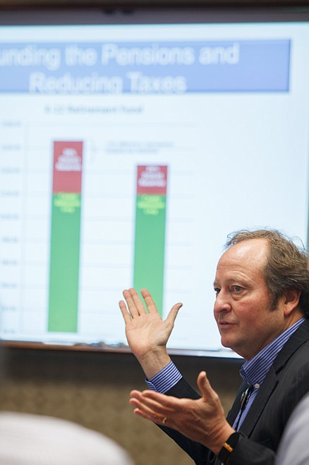 Patrick Cote/Daily Inter Lake Gov. Brian Schweitzer discusses the state of the Pubic Employee Retirement System Tuesday afternoon. Tuesday, April 17, 2012 in Kalispell, Montana.