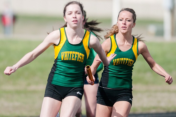 Whitefish’s Amanda Foley, right, hands the baton to Amarlow Shulz during the 400-meter relay at Glacier High School Tuesday.