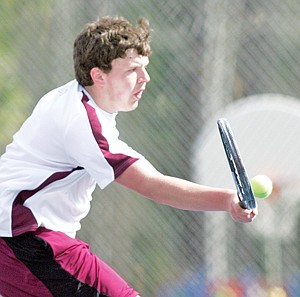Troy's Bruce Metz in No. 2 singles vs Ronan's Kyle Yankey. Metz over Yankey 6-3, 6-7, 5-7, 6-3