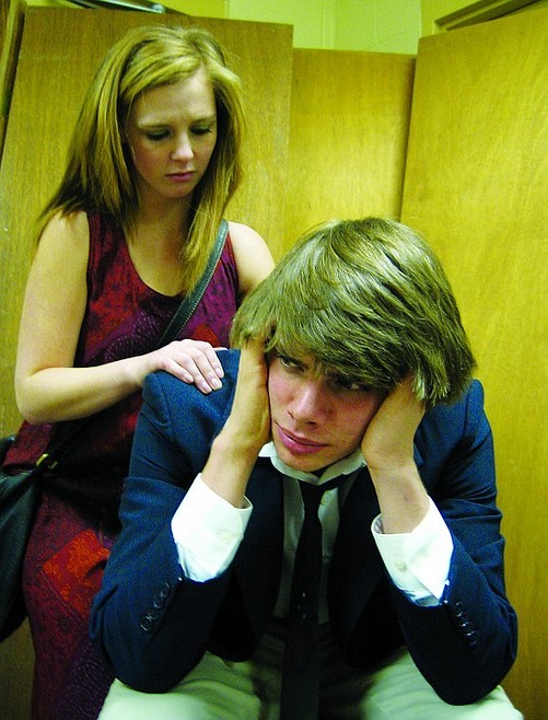 Alice, played by Emily Creighton, comforts Charlie, played by Dwight Camillucci, as he agonizes over the realization that his newfound intelligence is only temporary in “Flowers for Algernon.”