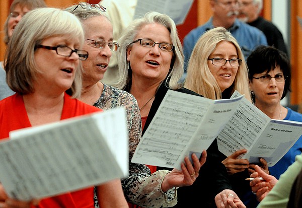 From left, Leanne Roberts, Donna Marx, Julia McKay, Kathryn Friedman, Karen Moes practice with the Crown of the Continent Choir on Wednesday, April 18, at Flathead High School. The choir and Headwaters Ensemble will be presenting a multi-faith concert under the direction of Kevin Allen-Schmid at 7 p.m. on Sunday, April 29, at the O'Shaughnessy Performing Arts Center in Whitefish.