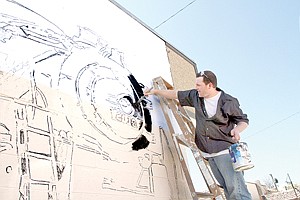 Jeff Adamson works on the mural on the north side of the building at 311 Mineral Ave.