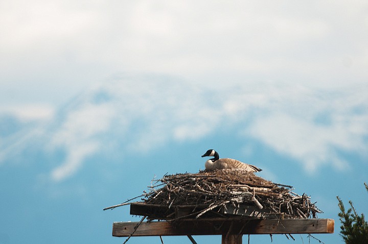 A Canada goose sits in an osprey nest atop a power pole near Lakeside.