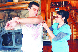 Brenda Ahearn/Daily Inter Lake Jason Miller and his sister Rebekah Miller look at the scars he received at her home on Thursday morning, April 19, in Libby.