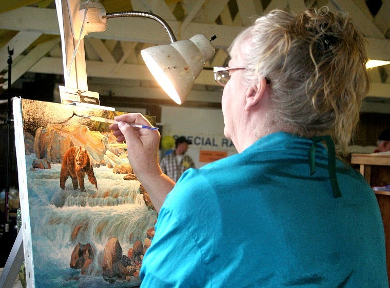 Wilson then described a few of the highlights she personally found entertaining from the night’s events. She said it was a hilarious sight to see Orville Kuester of Plains make an appearance on the auction stage in a camoflouge nightie, fuzzy slippers and wig when the auction item Sex Peak Lookout Giveaway was presented. She also described the oil painting by Marla “Ma” Brown-Robbins, titled ‘Glacier Grizzly,’ was sold for a whopping $800. Brown-Robbins had spent most of the evening of the banquest adding the finishing touches to the painting while guests watched.
