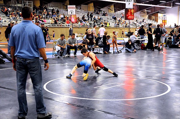 Eric Dolence, 9, of Ronan, in red, wrestling with Duane Otto, 9, of Lewistown, Mont., on Saturday morning, April 28, at the Montana State Freestyle/Greco Championships at the Majestic Valley Arena. Dolence won the match up with a technical fall.