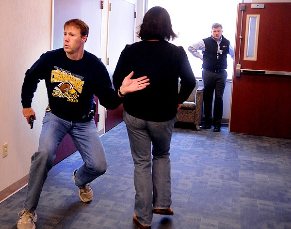Wade Rademacher of the Kalispell Police races out to protect the released hostage in the gunman scenario training exercise on Monday at the Kalispell Regional Medical Center. Rademacher was the incident commander for the event.