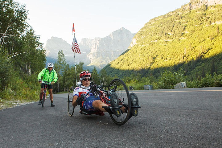 U.S. Air Force veteran Steve Taylor, right, rides a hand bike up Going-to-the-Sun Road early Wednesday morning in Glacier National Park. Taylor is one of five veterans riding across the country as part of the Long Road Home Project. Nelson Barker, left, rode along with Taylor for support. The group left Wednesday from Hungry Horse and rode over Logan Pass to St. Mary.