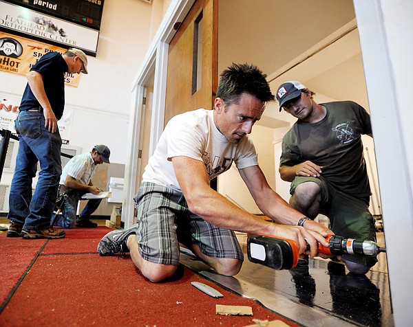 Jeremy Harmon, of Western Building Supply, center, and James Randall, of Hammerquist Casalegno Inc., work on replacing the doors in the Flathead High School gymnasium on Saturday, Aug. 4. In the back ground are Tom Kern, left, of Western Building Supply, and Kirk Hammerquist.