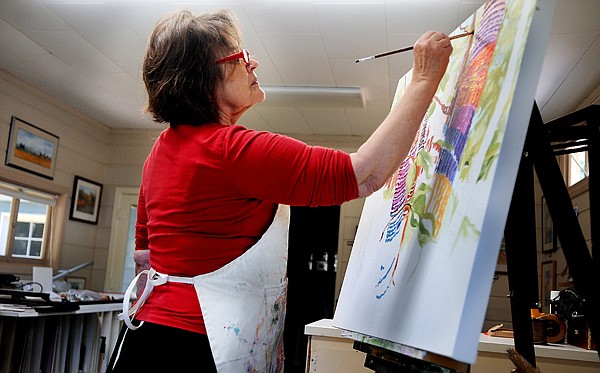Lavonne Burgard works on a painting for the upcoming Taste of Kalispell Invitational Art Exhibition, which opens this Saturday, Aug. 11, at the Museum at Central School in Kalispell. More than 20 local artists were asked to create pieces for the show depicting contemporary Kalispell. Burgard chose yarn bombing at the Hockaday Museum of Art for her subject. Taste of Kalispell is Saturday from 5 to 10 p.m. The art work will remain on display in the main entrance hall of the Museum at Central School through Sept. 30.