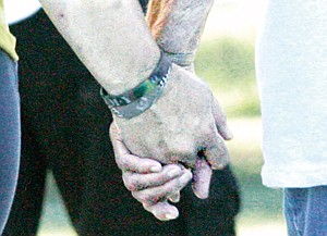 Lynette Rebo, left, holds hands with her mother, Arlyne Beito. The caring hands are a symbol of the survivor-cargiver relationship.