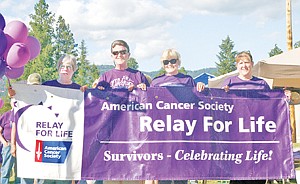 Judy Bloomer, left, Doc Sargent, Paula Darko-Hensler and Rainy Roth hold the survivors banner as they begin the first of many laps around Asa Wood School’s field for Lincoln County’s Relay for Life.