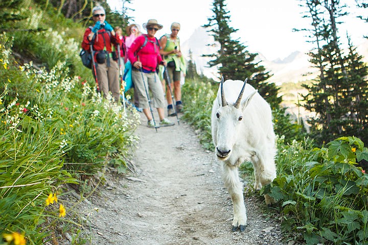Hikers watch a mountain goat walk along the Highline Trail on Aug. 1 in Glacier National Park.