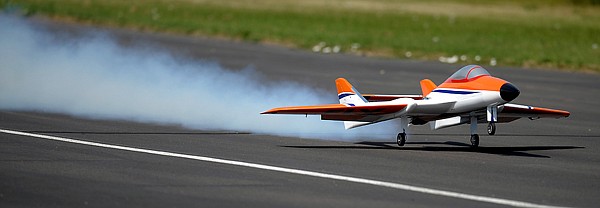 Ad Clark's King Cat model jet takes off on Monday afternoon, August 6, at the Glacier RCers air field south of Whitefish. The plane weighs about 30 pounds and is traveling between 50 and 60 miles per hour at take off. The jet carries 2 liters of fuel which works out to between 6 and 8 minutes of flying time.