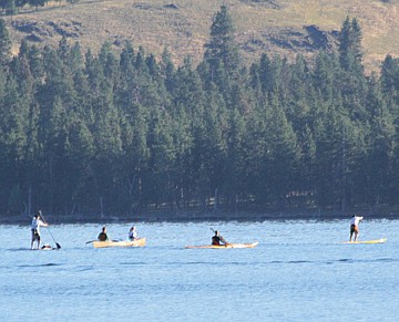 Participants in the 24-mile Epic Shore to Shore Race paddle their way through Flathead Lake on Saturday off the shore of Camp Marshall. Proceeds from the race went to First Descents, which provides free outdoor experiences for young adult cancer patients.