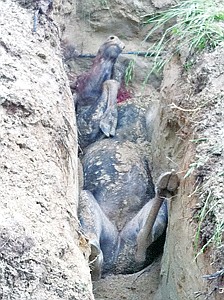When he was found in the water line trench on Russ and Kathy Wilson’s property on Bull Lake Road, it took several hours for excavators to get the wedged animal out.