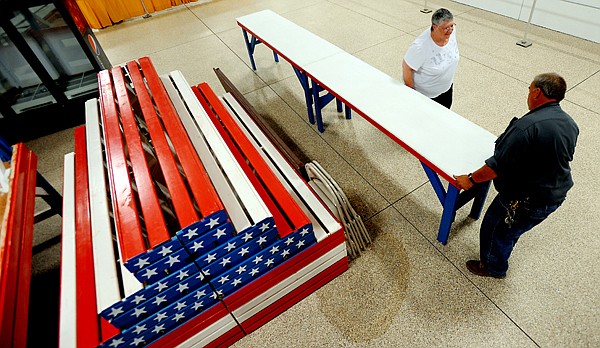 Diane Slobojan, Home Culinary Superintendent, gets some help setting up tables at the Fair Expo Building on Friday morning, August 10. Slobojan has been decorating her section in red, white and blue for years in honor of her son who serves in the U.S. Coast Guard.