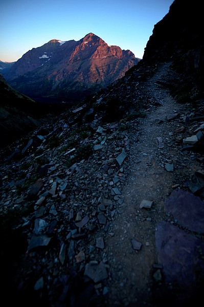 View of Scenic Point Trail as the first rays of sunrise begin to light the mountains of East Glacier on Sunday, July 29. The trail is 6.2 miles out-and-back with an elevation gain of 2350 feet.