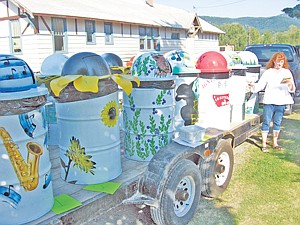 Libby Area Chamber of Commerce Executive Director Shanda Jennings keeps a tally on the bids for placement of the artistic canisters. The event raised $775 for local artists.