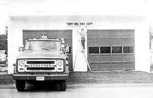 New at Troy Fire Chief Ken Hays hangs the Troy Volunteer Fire Department sign, putting the finishing touch on he new building that now houses the departmet equipment. Constructed entirely of cement block with a concrete floor, the 34-by-40-foot structure has two stalls to accommodate the new truck received by the Fire Department, shown here, and the old truck, a 1942 Seagraves it replaces, which will be retained for auxiliary or emergency use. The fire truck committee planned the building , which has been painted white with doors and sign lettering of fire engine red. A lot of volunteer labor from the firemen went into constructing and painting the building, which replaces the one attached to the City Hall about 30 years ago. The firemen painted the doors, hung the sign, installed a propane heater, refrigerator and moved the new fire indicator panel in preparation for the arrival of their new truck. Photo from the July 27, 1972, files of The Western News.